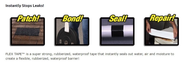 > > FLEX TAPE- super strong waterproof tape that can patch, bond, seal and stop leaksFeatures: