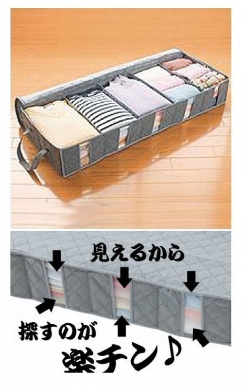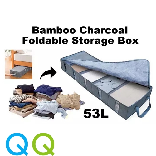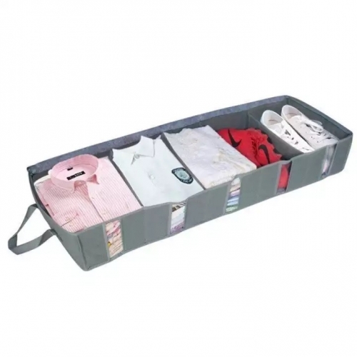> > > QQ 5-Slot Foldable Bamboo Charcoal Fiber Non-Woven with Clear Window Under Bed Long Zipper Storage Organiser Box Bags Container for Blankets, Clothes, Shoes, ComfortersFeatures:- Organizer box with 5 compartments.- Comes with handles for easy carrying.- With transparent windows.- Ideal for keeping clothes under the bed.- Bamboo charcoal fiber has the benefits of removing moisture and unpleasant odors.- Can be folded to save space when not in use.- 53L, can store 40~50 thin clothes, such as underwear, thin sweater and so on.Specifications:- Material: Bamboo Charcoal Fiber Non-Woven- Size: Approx.100cm(L) x 35cm(W) x 15cm(H)- Color: Grey
