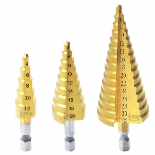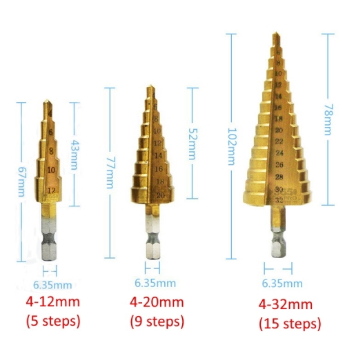> > > > Step Drill Bit Quick-Change Hex Shank 4-12mm/4-20mm/4-32mm HSS Titanium Coated Cone Pagoda ShapedFeatures