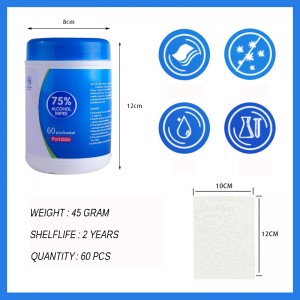 > > Portable Alcohol Sterilized Wipes Daily Cleaning 60pcs 75% Alcohol Wipes Wet Tissue Antibacterial Hygiene Wet Wipes Sanitiser Tisu alkoholFeatures:- Softer Touch, 2x Thicker, 2x Durable- Kills 99.9% of germs- Eliminate Cross Infection- Daily cleaningSpecifications:- Material: spunlace non-woven fabric- Weight: 45