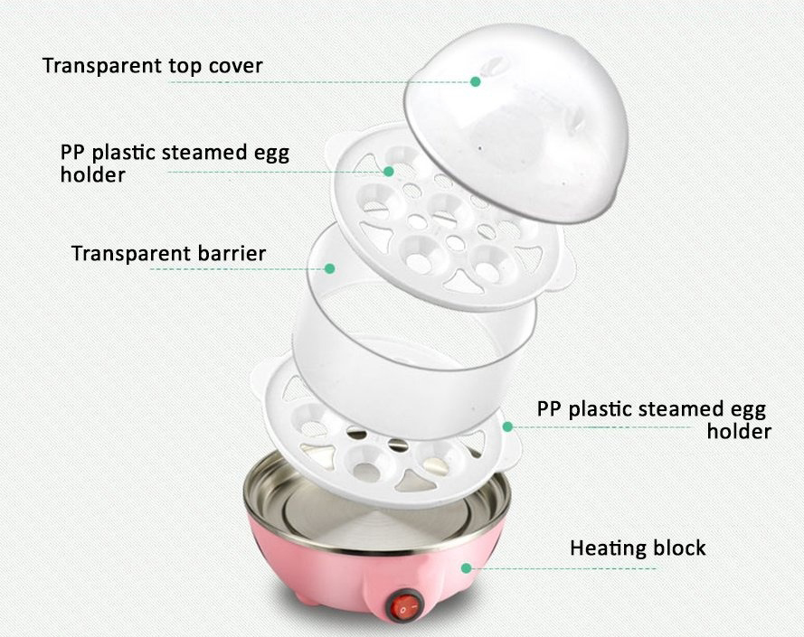 Features:• Easy to clean and operate• It can cook 1 to 14 eggs in minutes• Multi-function• Small and Easy storage• Stainless steel heating area• Energy savingSpecifications:- Voltage: 220V ~ 50Hz- Power: 350W- Number of eggs :1-14- Dimension: 175 x 175 x 240 mm- Color: PinkEasy And MUST have item in House for Busy life. Can Cook 2 dishes in once. (Steam Egg/soup/meat/vegetable) By Using one clickNo worry of electric shock or burn up as the steamer will auto off when the water is dry. Professional Heating Element help your food taste good.