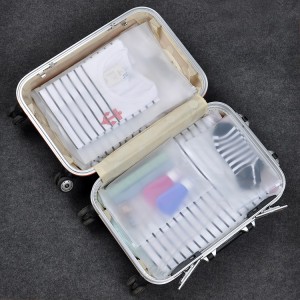 > > > READY STOCK QQ Waterproof Transparent matte Travel Makeup Unisex Women Bag Toiletry Cloth EVA Storage CaseFeature:*These bags are reusable, durable, waterproof, dustproof, portable, eco-friendly and multifunctional.*Best for packaging clothes, underwear, travelling commodities, such as cosmetics, towel, toothpaste, toothbrush, etc.Material: EVASize:-1) XXS: 10.5cm * 16cm2) XS: 14cm * 20cm3) S: 17cm * 25cm4) M: 20cm * 28cm5) L: 24cm * 35cm6) XL: 28cm * 39cm7) XXL: 35cm * 40cm8) XXXL: 40cm * 50cm
