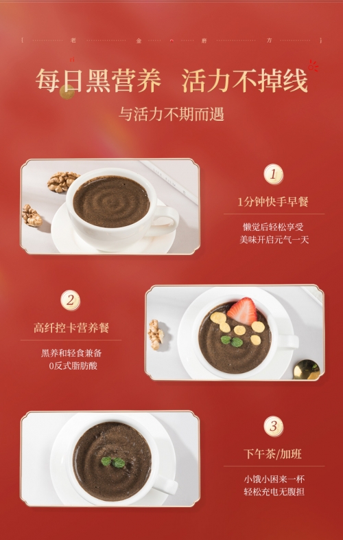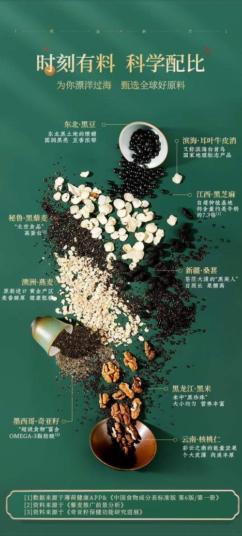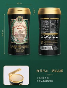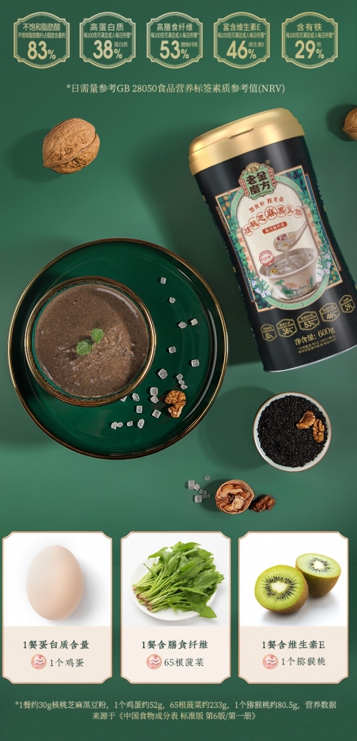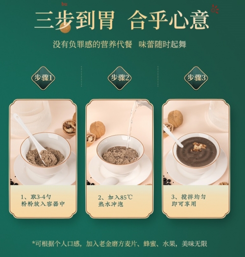 > > > > > > > QQ 600g LAOJIN MOFANG Black Sesame Walnut Black Bean Instant Breakfast Nutrition Food Supplement Cereal Powder 正宗老金磨方黑芝麻粉现磨纯黑芝麻核桃粉熟即食营养速食早餐代餐粉乌发黑发生发养发Features:- Suitable For: Hair Loss, White Hair.- Ingredients: Black beans (≧34.2%), black rice, black sesame seeds (≧10%), oats, walnuts, black quinoa (≧5.8%), chia seeds (≧5.3%), mulberries, cynanchum auriculatum ,crystal sugar.- Storage conditions: Sealed and stored in a cool and dry place.- Content: 600gSteps:-1. Put 3-4 scoops of powder into the container2. Add 85℃ hot water to brew3. Stir well and enjoy*According to personal taste, add oatmeal, honey, fruit for unlimited deliciousnessLao Jin Mo Fang (老金磨方), since 1912, is a company that insists on "pure natural, no additives", healthy food research and development , a one-hundred-year-old health food company.老金磨方,1912年至今,三代传承,五谷食补倡导品牌,是一家坚持“纯天然、无添加”,“药食同源”健康食品研发、生产与销售为一体的百年食品企业。适合族群·:严重脱发、头发稀疏、满头白发。配料:黑豆(≧34.2%),黑米,黑芝麻(≧10%),燕麦,核桃仁,黑藜麦(≧5.8%),奇亚籽(≧5.3%),桑葚,耳叶牛皮消,冰糖。食用方法:1. 取3-4勺粉粉放入容器中2. 加入85℃热水冲泡3. 搅拌均匀,即可享用*可根据个人口感,加入麦片,蜂蜜,水果,美味无限储蓄条件:阴凉干燥处密封保存净含量:600g