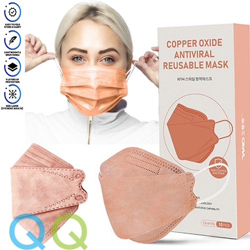 COPPER OXIDE ANTIVIRAL KF94 REUSABLE FACE MASK 4 PLY 1. Can use in public, filter particulate matter in the air, block droplets, blood, body fluids, secretions, etc. 2. Eliminate virus bacteria within 10 minutes. 3. Reusable, high inactivated rate. 4. Duration and time of usage is sixfold higher than the average mask. 5. Place the mask in a dry, windy or open-air area. Suggestion: Wear a copper oxide KN95 / KF94 mask (replace a new one 2-3 days)