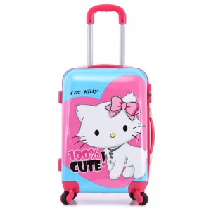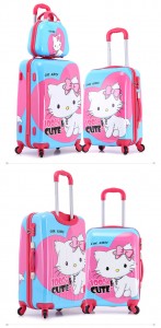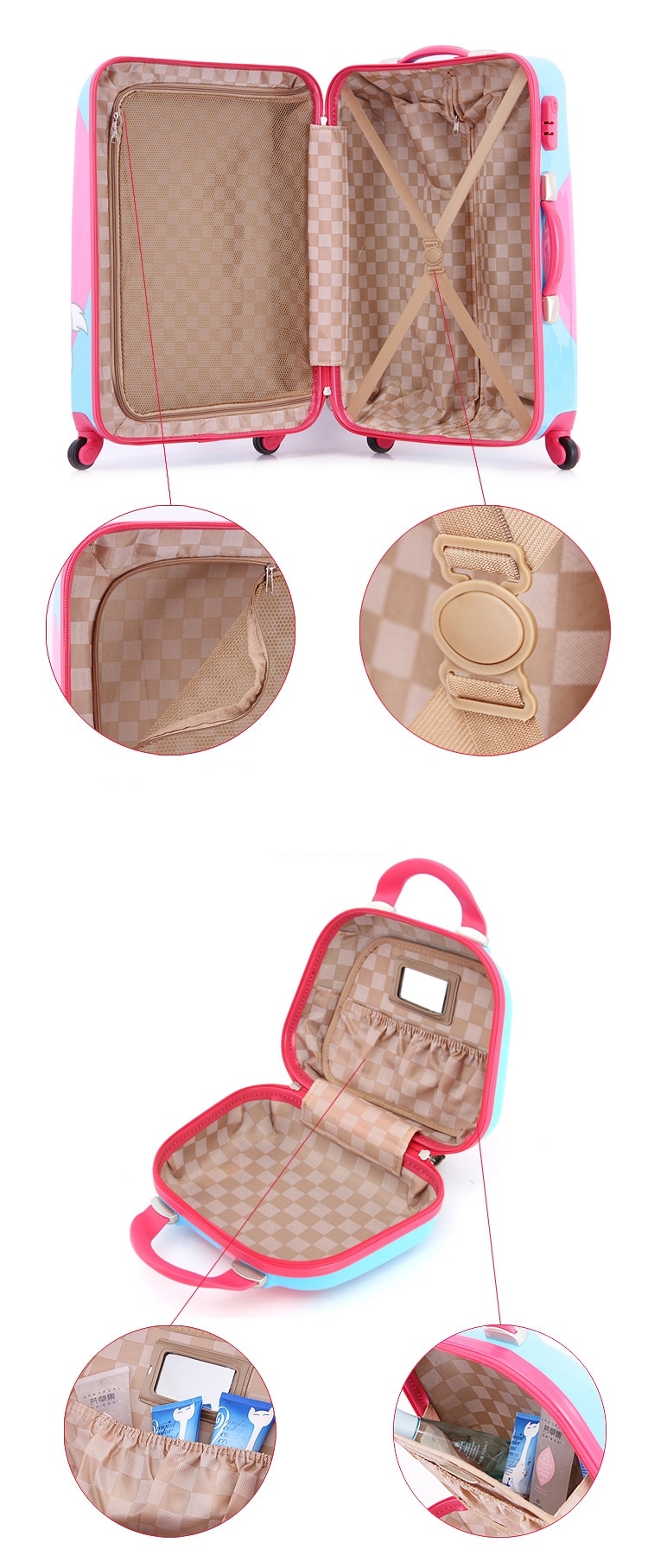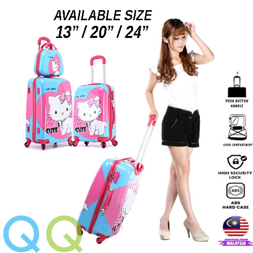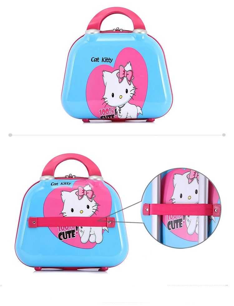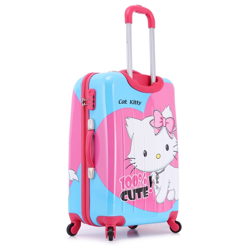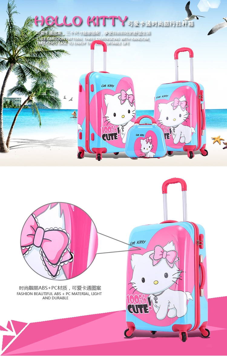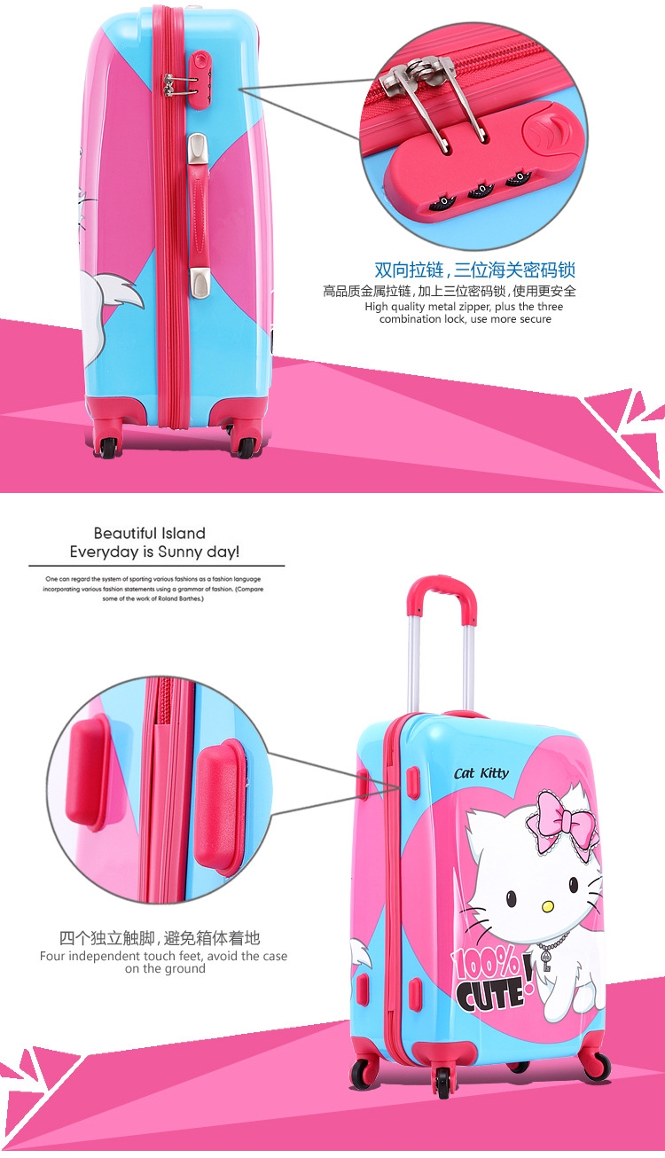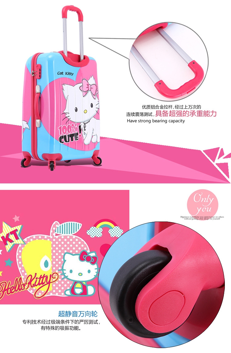 > > Korea Trend Trolley Case Universal Wheel Suitcase KT Luggage Cat Kitty Password Box Mother Luggage Cute Female Durable Hard Case Travel BagProduct Description◆Top and side carry handles◆Adorable Candy Coloured Luggage◆Shell material is made of highly impact-resistant plastic◆With Combination Lock◆360 degree ultra silent 4 wheels system◆Provides peace of mind when checking cases at the Airport◆Waterproof, highly durable and flexibleMaterial: ABS+PCpolyester Size: 13"/ 20"/ 24"